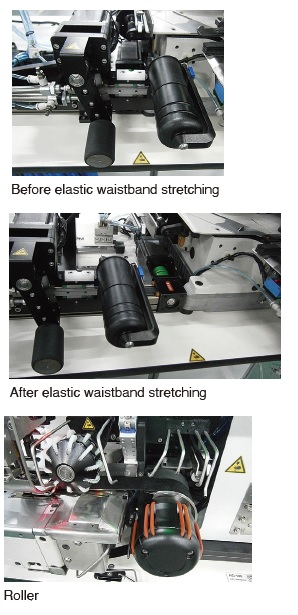 El error en la posición entre el inicio y el final de una costura para coser una pretina elástica plana es de 1 mm o menos. El sistema de control de bordes ayuda a producir costuras con acabados consistentes. Incluso un operador inexperto puede realizar este proceso difícil con facilidad simplemente colocando una pretina elástica plana y el cuerpo de la prenda en la máquina de coser. Esta máquina de coser es capaz de coser de 210 a 270 piezas de pretinas elásticas de talla L (longitud de cintura elástica: 39 cm) por hora, aumentando la capacidad de producción aproximadamente 1.3 veces en comparación con una máquina de coser de uso general.