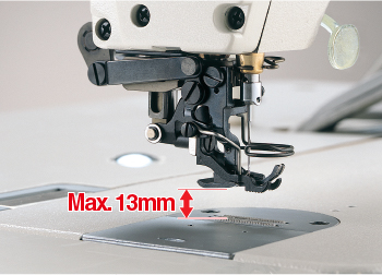 La elevación del prensatelas es de hasta 13 mm. La cantidad de alimentación superior se puede ajustar fácilmente operando el panel. La máquina incorpora un mecanismo de alimentación superior integrado que simplifica el área alrededor del prensatelas, lo que permite al operador colocar y manipular fácilmente un material en la máquina. La máquina puede operarse como desee el operador.