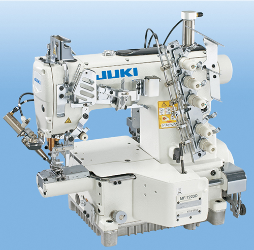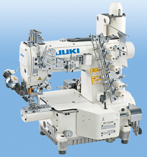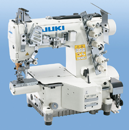 La máquina de coser se puede utilizar para coser puños de mangas, escotes y ropa infantil. Máquina de puntada de recubrimiento superior e inferior con cama cilíndrico pequeño La máquina de puntada de recubrimiento superior e inferior con cabezal semiseco y cama cilíndrico pequeño se ha añadido a la línea de productos de JUKI. Las características de cama cilíndrico pequeño y cabezal semiseco se han logrado dando prioridad a la facilidad de uso. La máquina de coser permite un trabajo de "costura" cómodo.