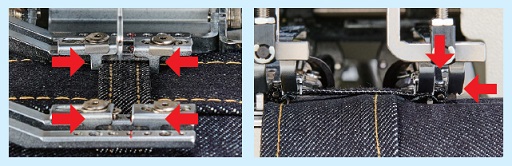 El tenedor plegable sujeta la tela según el grosor de la presilla, eliminando el desalineamiento de la tela dentro del tenedor y asegurando un doblez seguro. El prensatelas en forma de portón asegura firmemente las presillas y ayuda a prevenir puntas dobladas y saltos de puntadas.