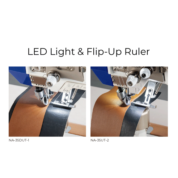 The LED light is located on the underside of the arm jaw. It reduces operator fatigue and improves work efficiency. It is provided as a standard for all models of the NA-35 Series. A flip-up ruler is standard equipment. Since the ruler is a flip-up type, it can be easily attached and detached without using a driver when not in use.