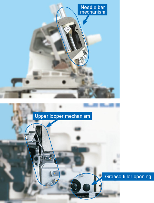 - The needle bar mechanism and upper looper mechanism have been re-designed to require no lubrication. - The most-advanced dry technologies, such as the special surface treatment applied to the major drive unit and the grease feeding method, contribute to higher durability. The machine does not splash oil after a long period of use. The grease filler openings are newly provided for the sewing machine in two locations, i.e., one on the upper looper component and the other on the sewing machine frame, thereby improving maintainability.
